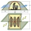 Палатка оснащена двумя вентиляционными окнами, расположенными в верхней части купола, что позволяет избежать невентилируемого объема, в котором собираются пар и продукты дыхания (СО2). Чтобы предотвратить попадание воды и снега в палатку через вентиляционное окно при сильных порывах ветра, под козырьком окна вшит ветровой клапан, принцип работы которого очень прост: он поднимается порывом ветра и перекрывает проход ветру, дождю и снегу. Двойные жесткие стойки надежно фиксируют вентиляционное окно в раскрытом состоянии для эффективной вентиляции. Величину раскрытия вентиляционного окна можно регулировать, в случае сильного дождя полностью закрыть окно на липучку Velcro.